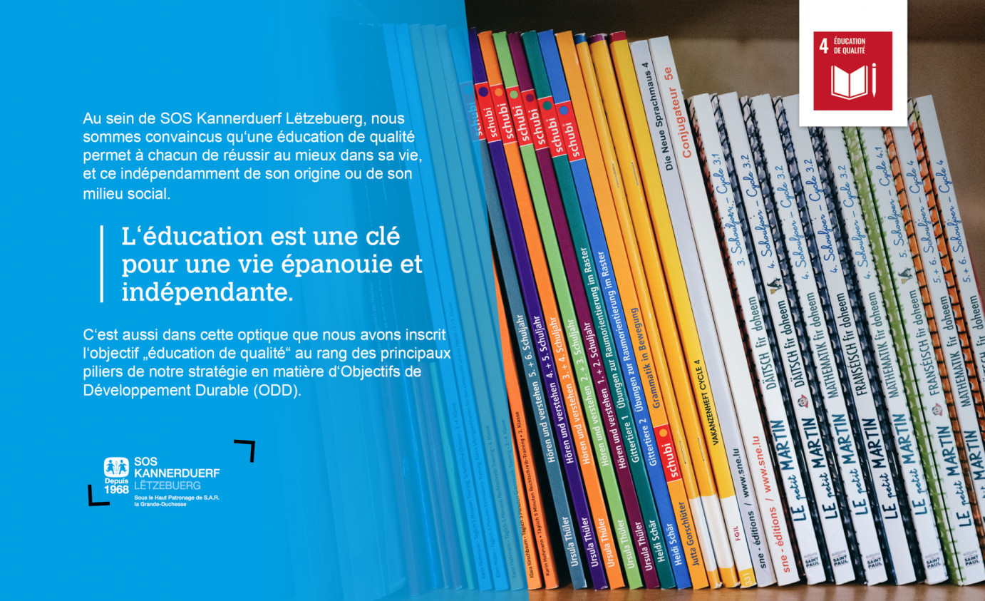 Déclaration de SOS Kannerduerf Lëtzebuerg : "Au sein de SOS Kannerduerf Lëtzebuerg, nous sommes convaincus qu'une éducation de qualité permet à chacun de réussir au mieux dans sa vie, et ce indépendamment de son origine ou de son milieu social. L'éducation est une clé pour une vie épanouie et indépendante. C'est aussi dans cette optique que nous avons inscrit l'objectif "éducation de qualité" au rang des principaux piliers de notre stratégie en matière d'Objectifs de Développement Durable (ODD)."