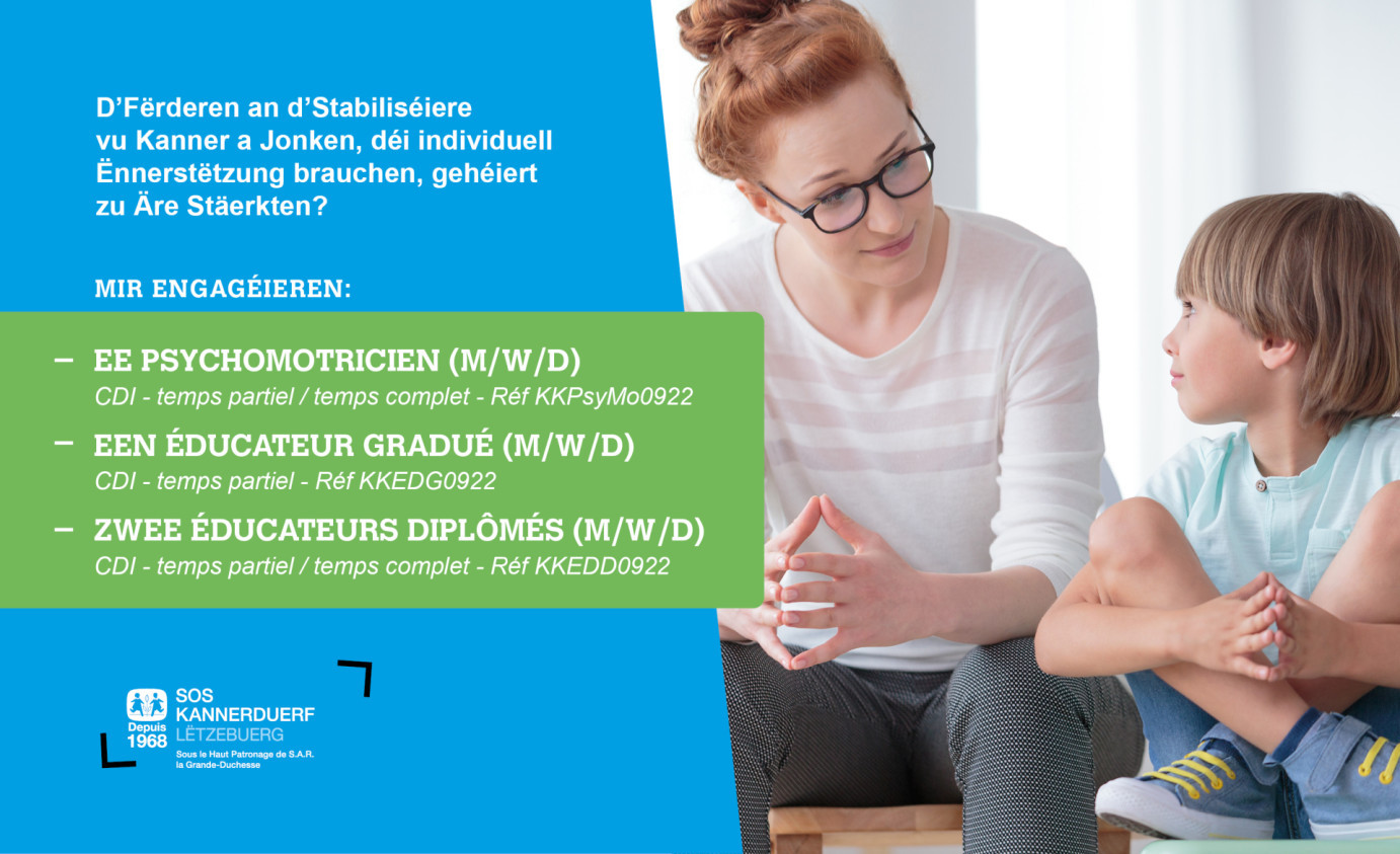 Wann Dir interesséiert sidd, schéckt Är schrëftlech Bewerbung (Liewenslaf mat Foto, Motivatiounsbréif, Kopie vum Diplom, Casier judiciaire n°3, n° 4 a n°5) mat der respektiver Referenz bis den 30. September 2022 un jobs@kannerduerf.lu.