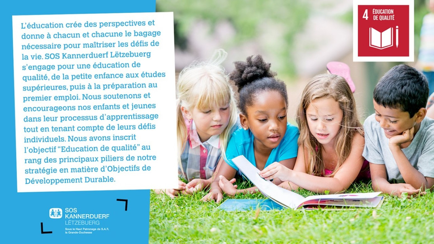 Déclaration de SOS Kannerduerf Lëtzebuerg : L’éducation crée des perspectives et donne à chacun et chacune le bagage nécessaire pour maîtriser les défis de la vie. SOS Kannerduerf Lëtzebuerg s’engage pour une éducation de qualité, de la petite enfance aux études supérieures, puis à la préparation au premier emploi. Nous soutenons et encourageons nos enfants et jeunes dans leur processus d’apprentissage tout en tenant compte de leurs défis individuels. Nous avons inscrit l’objectif “Education de qualité” au rang des principaux piliers de notre stratégie en matière d’Objectifs de Développement Durable.