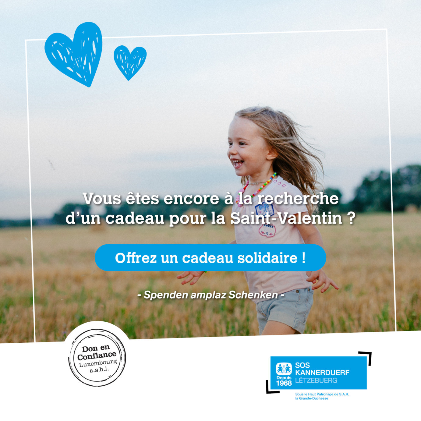 Faites plaisir à un être cher avec un don pour SOS Village d’Enfants Luxembourg ! Pour la Saint-Valentin, la communion ou un anniversaire … Partagez votre joie et votre solidarité avec vos proches en leur offrant un cadeau sous forme d’un certificat personnalisé.