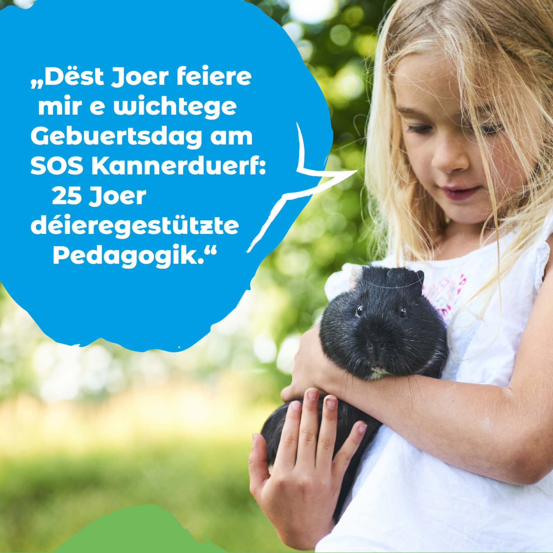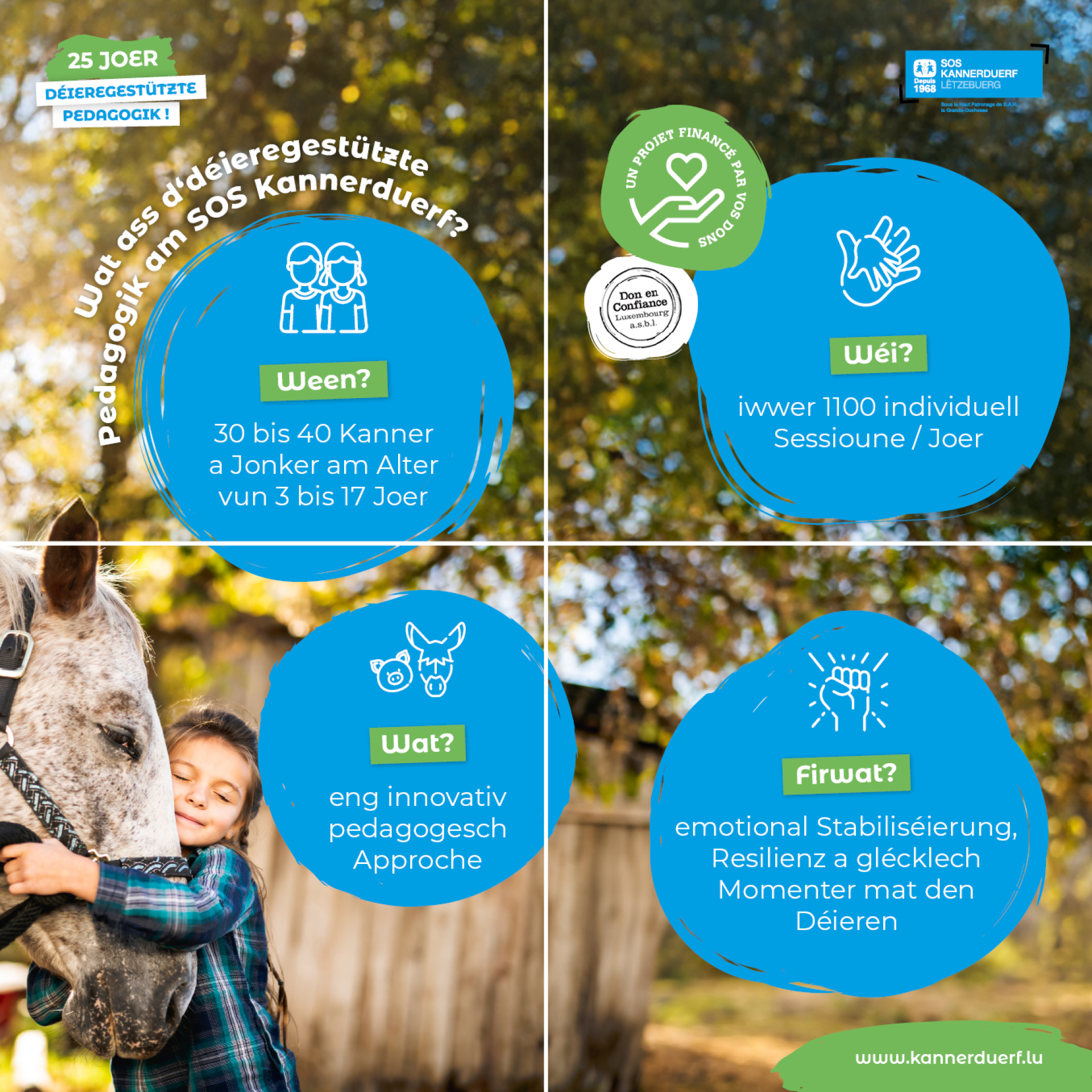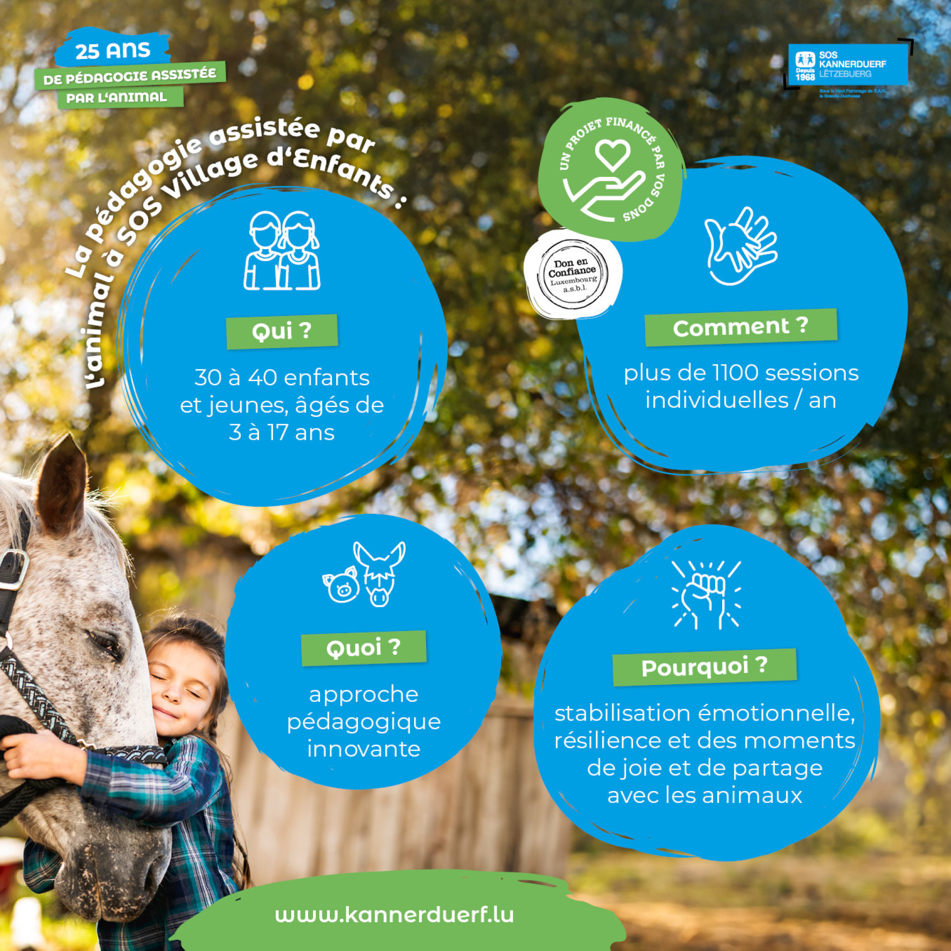 En 2024, SOS Village d’Enfants Luxembourg célèbre 25 ans d'engagement en faveur des enfants et jeunes à travers la pédagogie assistée par l'animal. Ce projet, conçu pour soutenir le développement personnel et la stabilisation émotionnelle des jeunes confrontés à des situations de vie complexes, a prouvé son efficacité. Financé principalement par des dons privés, il continue à transformer la vie des enfants dans un cadre bienveillant et adapté.